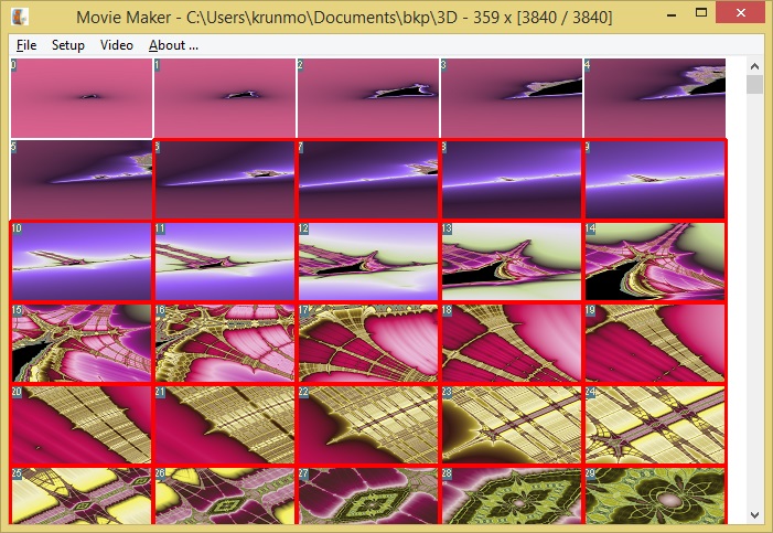 ![]() First step is to render the key frames in Kalles Fraktaler, which can be downloaded here. Zoom size must always be set to 2. Please note that the key frames needs to be at least twice the width of the movie. Larger with gives more antialias. You also need to have a higher height ratio than the resulting movie, due to the applied perspective. A suggestion is the render the key frames in 3840x3840 for a movie of 1920x1080. Use Kalles Fraktaler Arbitrary Size option to set the ratio you need. For 1920x1080 movie: 1x1: 640x640 -> 3840x3840(minimum) -> 5760x5760(good quality) -> 7680x7680 (extra quality) the 3D projection angle must be greater than 40o 16x18: 640x720 -> 3840x4320 (minimum) -> 5760x6480 (good quality) -> 7680x8640 (extra quality) the 3D projection angle must be greater than 35o When the key frames from Kalles Fraktaler, KFB, are completed, open MMY3D and select the folder with the menu command "File->Folder open..." You will be prompted that there are no KFY files and asked to convert the existing KFB files, choose yes. You will then be prompted to select the size of the preview images of the frames. If you need space on your hard drive, you can delete kfb and jpg files. When the convertion is complete, all preview images of the frames will be visible in the main window The frames of interest needs to be selected by holding shift for multiple selection. The selected frames will be indicated with a red border. | |||||||