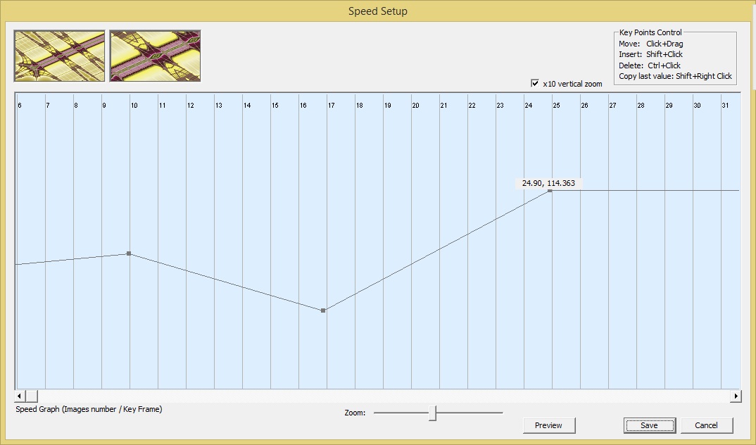 ![]() From the menu "Setup->Speed Setup..." The Speed Setup windows is opened. The selected frames are listed and different speed can be specified for each key frame New values are added by holding shift and click Speed values can be moved by click and drag Speed values can be deleted by holding control key and click The check box "x10 vertical zoom" can be unchecked to be able to enter higher values The zoom of the graph can be changed by draging the zoom control. Video Browser (Here VLC) is the media player used for avi file created when press Preview button in Speed or color setup | |||||||