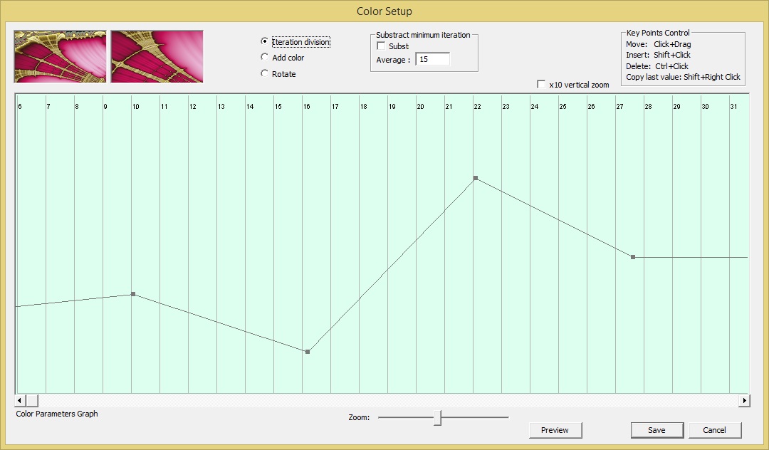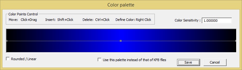 ![]() From the menu "Setup->Color Palette..." the Color Palette dialog is opened Here points can be added to a 512 colors palette: Color Sensivity means a global parameter which grow div and decrease rotation Rounded / Linear means Linear: Interpolation of colors between to points is linear. Rounded: Interpolation of colors between to points is made with cosinus function. Use this palette instead of that of KFB files indicates that only this palette will be applied. Click+Drag to move points Shift+Click to add points Ctrl+Click to delete a point Right Click to define a new color | |||||||