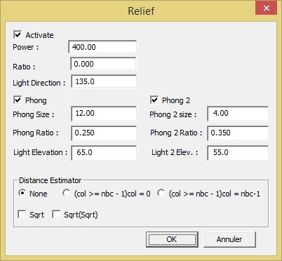 ![]() From the menu "Setup->Relief..." the Relief dialog is opened Here brightness are applied on the slopes of the patterns, from a light source. Checkbox Activate indicates if this effect will be applied Power is defining the strenght of the relief effect Ratio is defining how much the relief effect will be applied, 0 means no effect, 1 means max effect. If Power is low and Ratio is high, the relief will be thin and distinct. If Power is high and Ratio is low, the relief will be large and soft. Light direction is defining the direction of the light Two Phong effects can be specified. These defines smaller and stronger light reflection effect and gives a shining result Phong Size defines the size of the light reflection. A small size (1.0) give a large shinning zone, a big size (15.0) give a very small (thin) shinning zone (As in ray tracer). Phong Ratio defines how much effect will be applied, 0 means no effect and 1 means max effect. Good range is [0.05, 0.3] Tip : Set to 1 to see where phong appear and don’t forget than Power as a big effect on where the phone will appear. Light Elevation Is the angle (range 0-90o) between ligth and horizontal plane from where the phong reflexion is computed. If angle is low phong appear on big slope, if big phong appear on low slope (quasi plane surface). Distance Estimator defines if distance estimation is to be applied col>=nbc-1)col=0 col>=nbc-1)col=nbc-1 - nbc is the number of color in the palette. nbc-1 is the last color of it. When distance is very low you can decide to use last color (col=nbc-1) or first color (col=0). Its usefull to make multi-layer in video composition. Sqrt means that slope will be square rooted, which will smoothern out big changes in iterations Sqrt(Sqrt) means that Sqrt will be applied twice, for more smoothering | |||||||