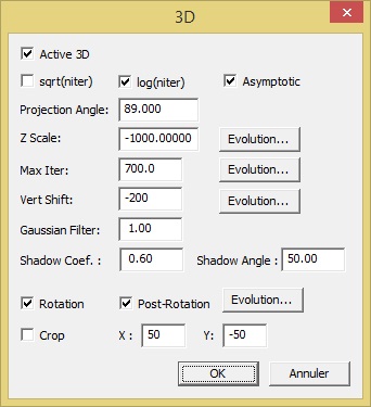 ![]() From the menu "Setup->3D..." the 3D dialog is opened Activate 3D indicates if 3D effect is to be applied z is Z Scale*function(niter-ExponentialAverage(MinimumIteration(InFrame),Average) sqrt(niter) means squaring iteration values before used as z-axis, function(z)=sqrt(z) log(niter) means logarithming iteration values before used as z-axis, function(z)=log(z) Asymptotic means means function(z)=0.63661977*atan(z / MaxIterCur)*MaxIterCur f(z)=z if z is very small, f(z)=MaxIterCur if z very big Projection angle is the perspective angle, between 0 (from the side) and 90 (from above). The less value of the projection angle used, the more high ratio is needed for the key frames. Z Scale is the scale of the iteration values used for hight. If negative, the projection will be concave. Z Scale value can be changed via a settings dialog similar to Speed. It defines a graph of a multiplicative factor applied to Max Iter means function(z)= min(z,Max Iter) min is applied before sqrt log atan. Max Iter value can be changed via a settings window similar to Speed. It defines a graph of a multiplicative factor applied to Max Iteration along the movie. Vert. Shift means the amount of pixels the images will be moved, up or down. Different projection angles needs different values of this field. Vert. Shift value can be changed via a settings window similar to Speed. It defines a graph of a multiplicative factor applied to Vertical Shift along the movie. Gaussian Filter means exp(-gf*d^2) average is applied on each pixel, where d is the distance in pixels from the computed pixel and its neighbors. gf calculated for that the value of exp is 1% when d is the Gaussian Filter parameter given (Not simple to explain in two words). The value is relative to 1920. If an other video width is used it is multiplied by VideoWidth/1920. It is the same for Z Scale and Vert. Shift. High value takes longer time to render Shadow Coef. means how much shadow effect will be applied. 0 is max and 1 is no such effect. Shadow Angle means the angle of shadows. 90 means no shadows and 0 means maximum shadow lengths Rotation indicates if rotation is to be applied. The rotation will be applied on the iteration buffers and requires large key frames to avoid alias artefacts. Post-Rotation if this box is checked the rotation will be applied as the last step. This makes rotation work with smaller key frames however makes the result somewhat blurry. Crop will crop the edges of the final movie to avoid shadows being cut off. X is positive and Y is negative. | |||||||