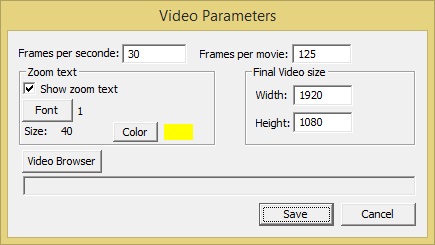 ![]() From the menu "Video->Video Parameters..." the Video Parameters dialog is opened Frames per second sets the frames per second, 30 or 60 is recommended Frames per movie sets the movie length. It is recommended to use the value 500 for a movie of size 1920x1080. This is because raw AVI format usually have an upper limit of file size The size 1920x1080 is the recommended size for a HD movie, however you can make a smaller preview movie with lower values, which will be rendered significantly faster Show zoom text indicates if zoom text is to be displayed or not Font button selects the font. Color button selects the color of the text. Final Video size set the final video size in Width and Height. Video Browser (VLC is recommended) is the media player used for avi file created when press Preview button in Speed or color setup | |||||||